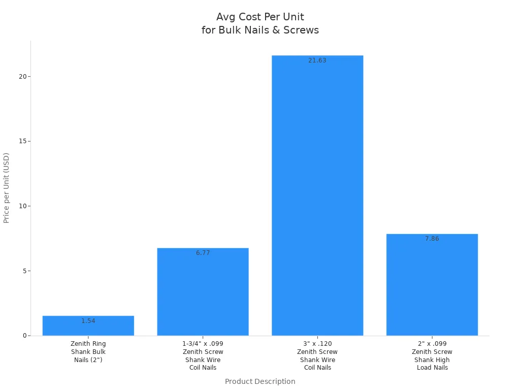 If you want to keep your project budget-friendly, ring shank nails usually cost less than screws. You can buy them in bulk for about 1 to 1.5 cents each. That adds up to big savings on large jobs. Here’s a quick look at some common prices: